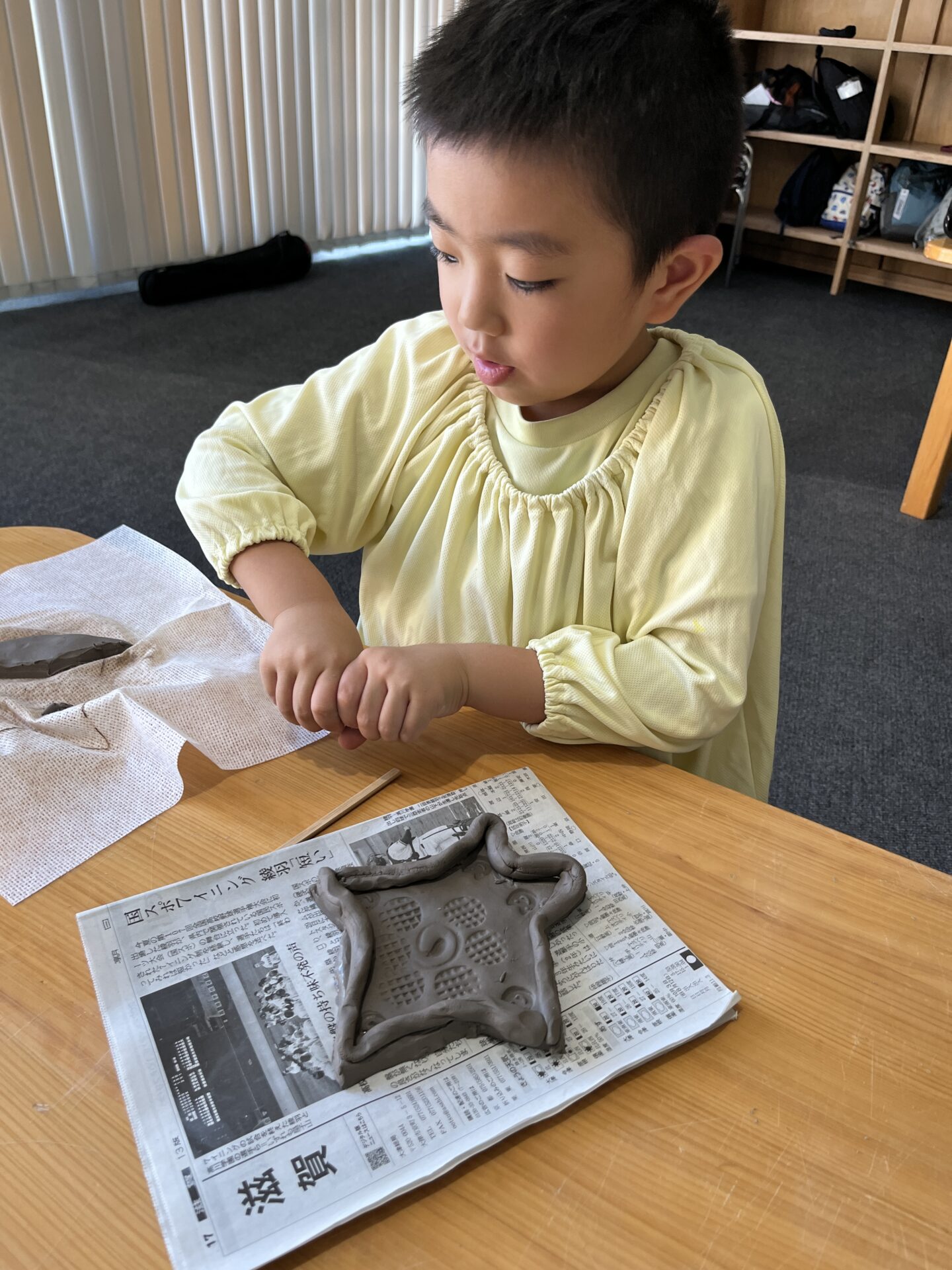 粘土が平らになったら、好みのスタンプをたくさん押して柄をつけました。
