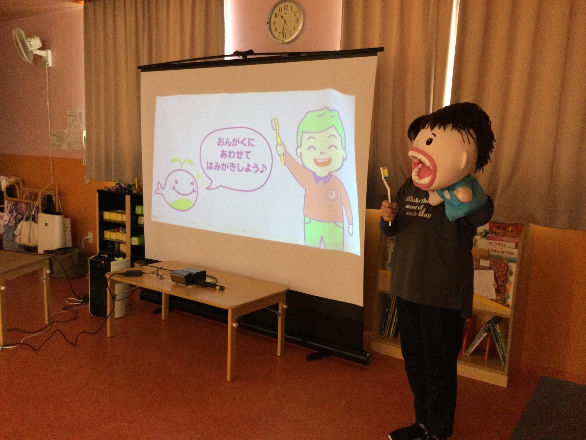 暗くした部屋で、プロジェクターを使って「虫歯を防いで丈夫な歯にしよう!」の話しを聞きました。