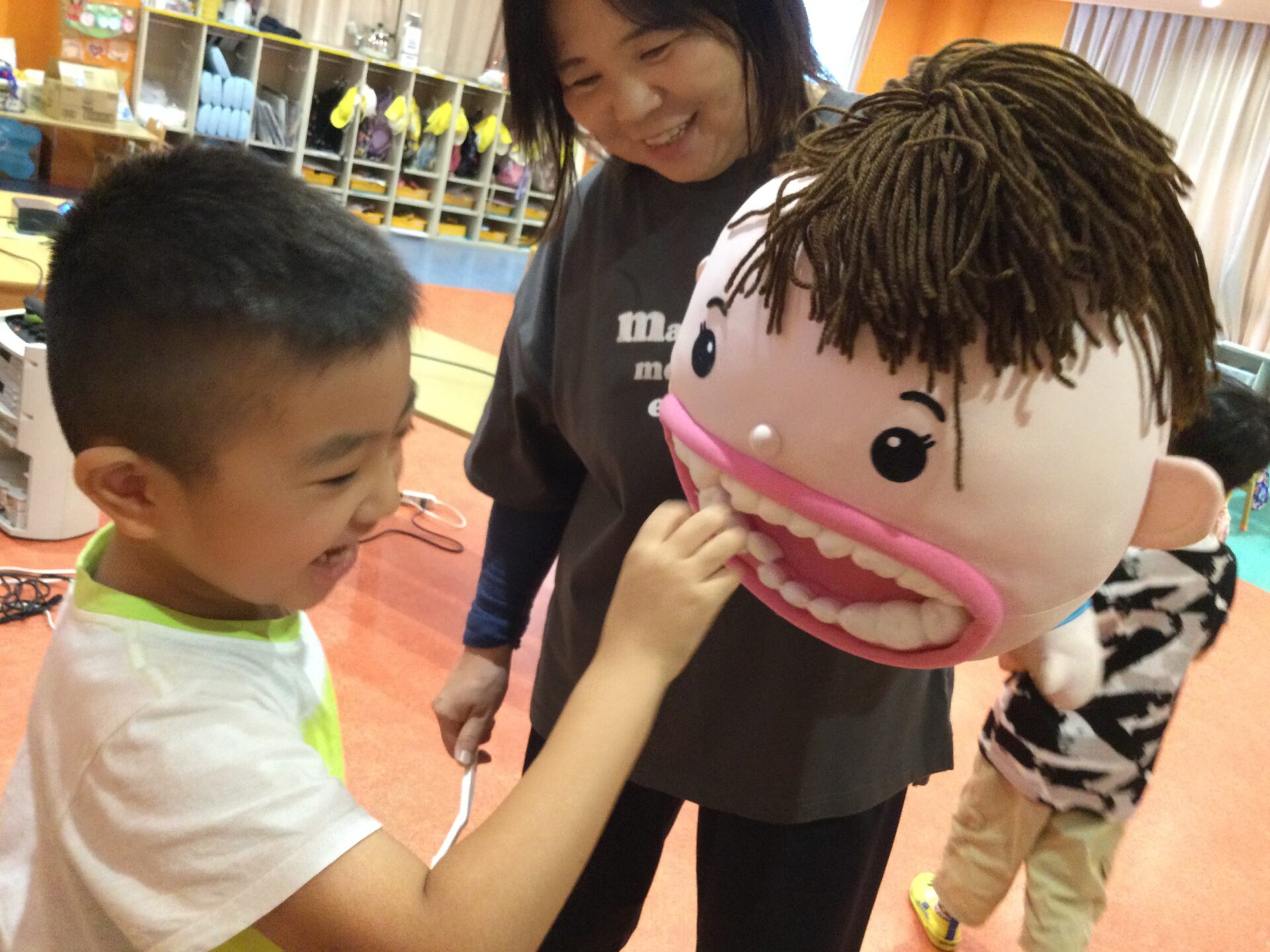 歯みがき指導のパペット『ててちゃん』も一緒に磨きます。