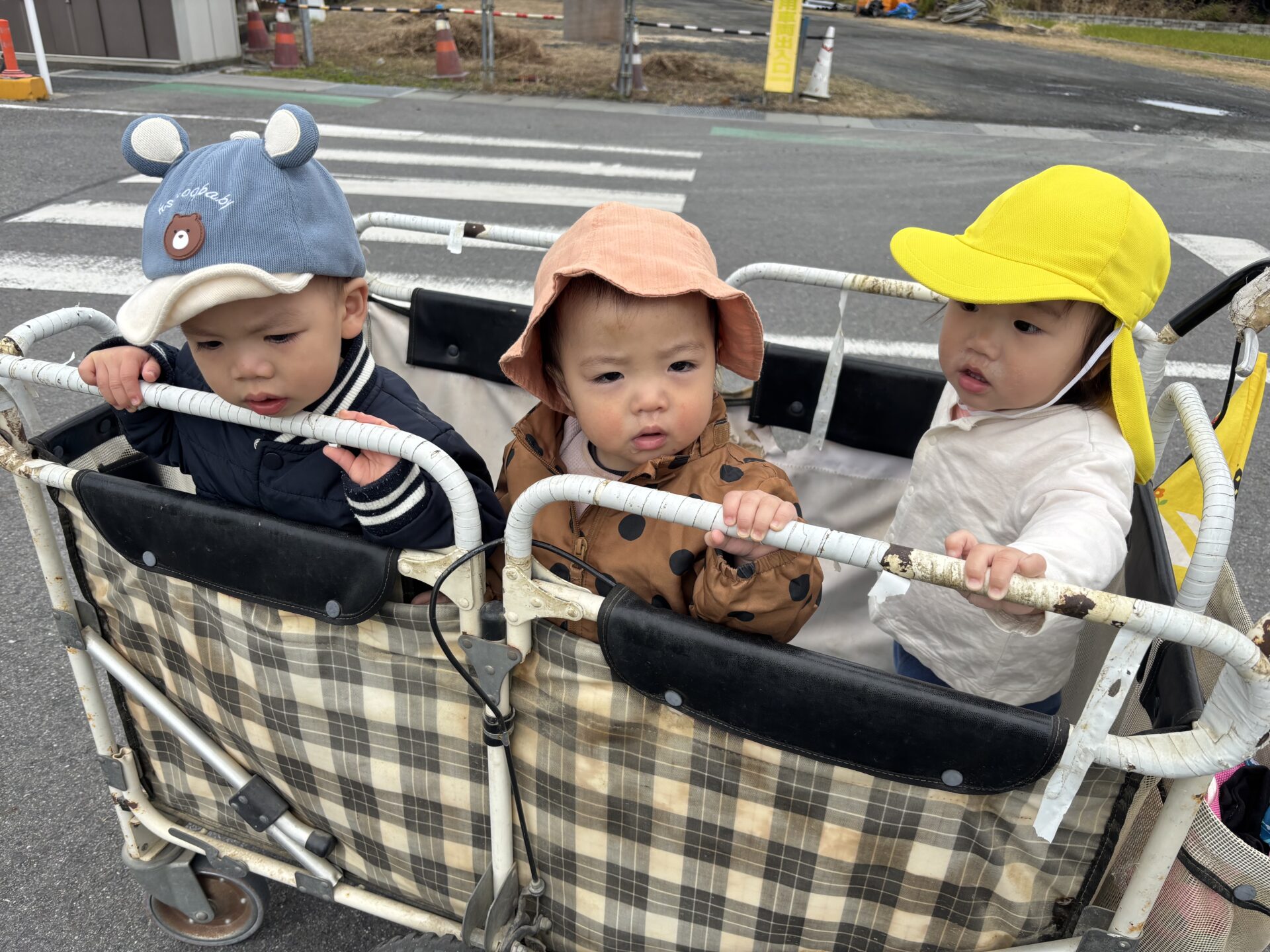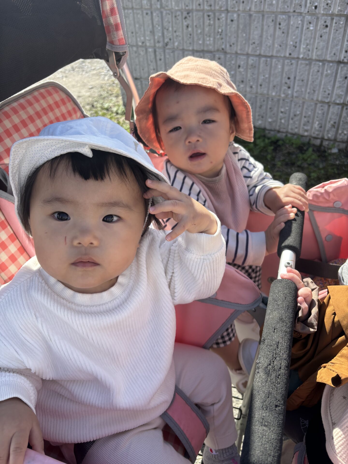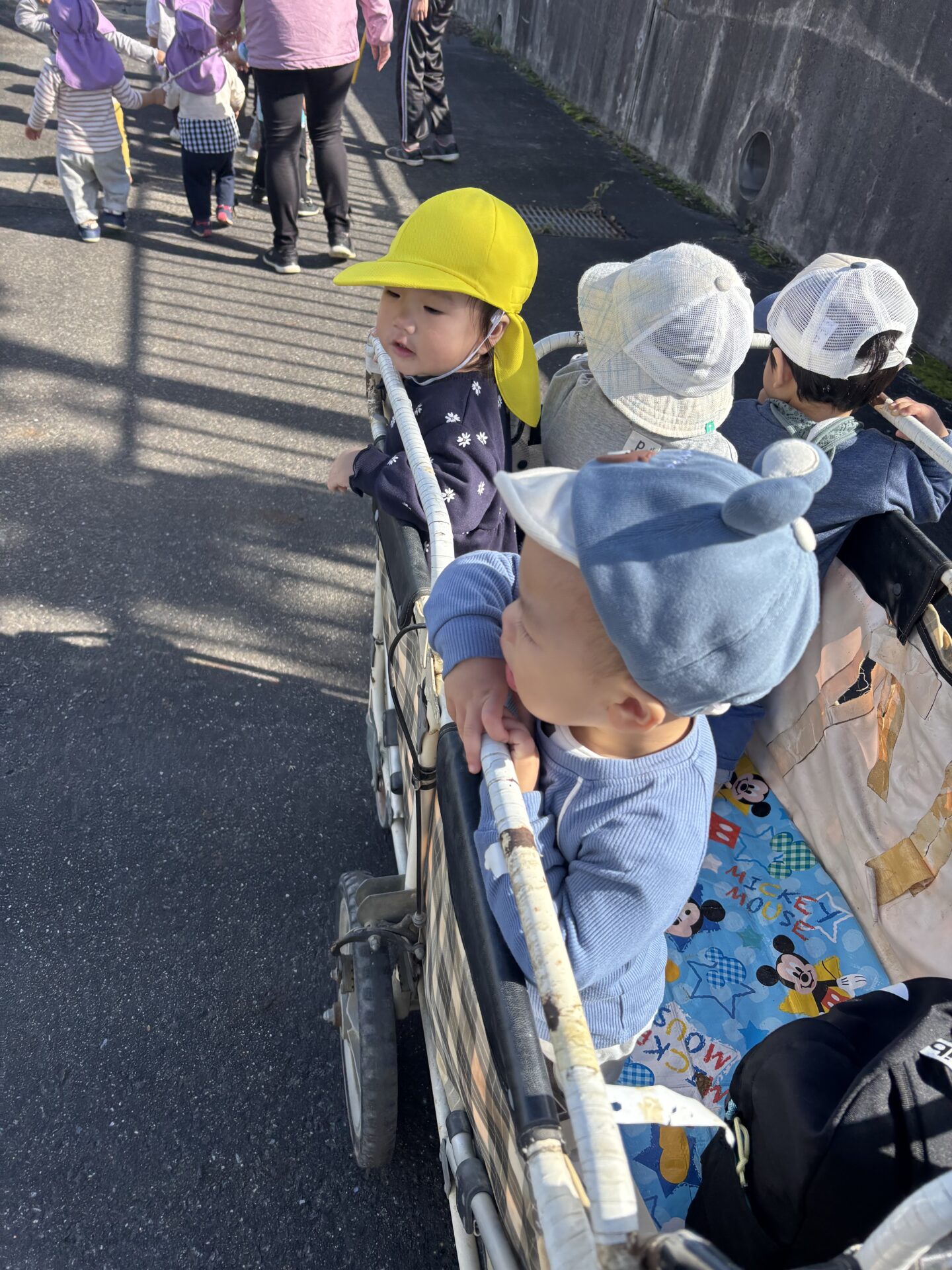 散歩しているとパトカーがあり「パト」と声を出して見たり畑の野菜を指差ししたり、葉っぱや木の実など興味津々に見ていました。