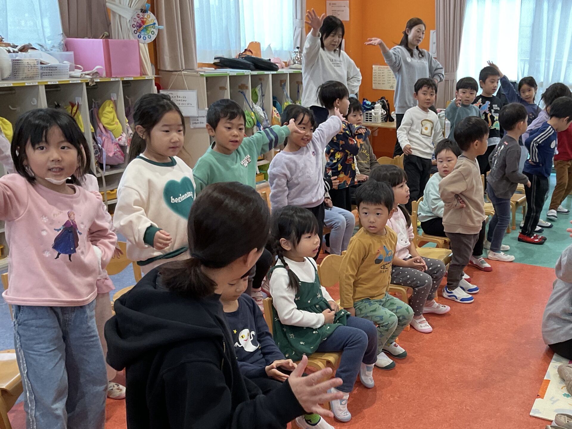 あさの体操で踊っている『ミッキーマウスマーチ』が始まると、うたいながら踊って楽しんでいた子どもたちです😄