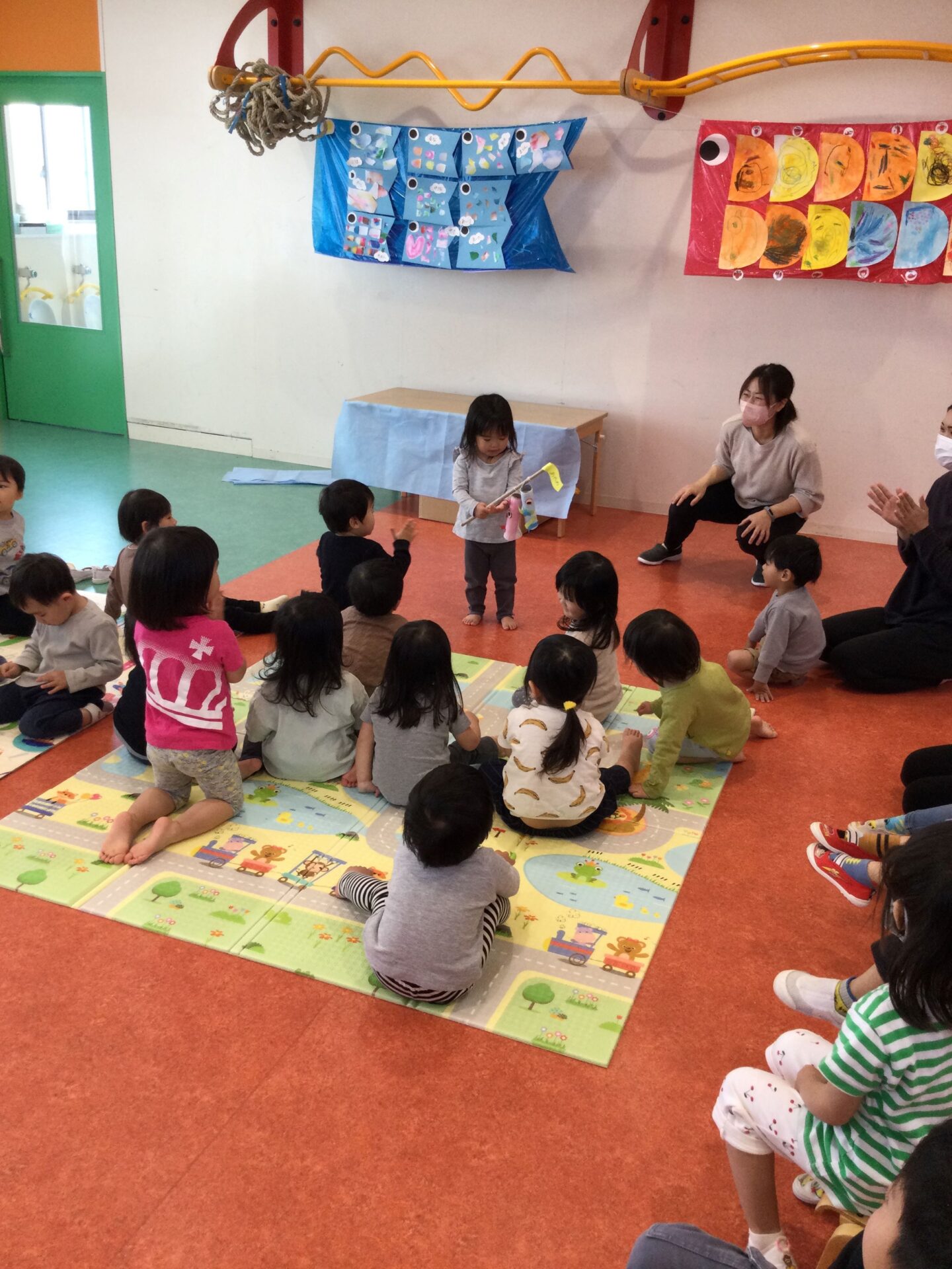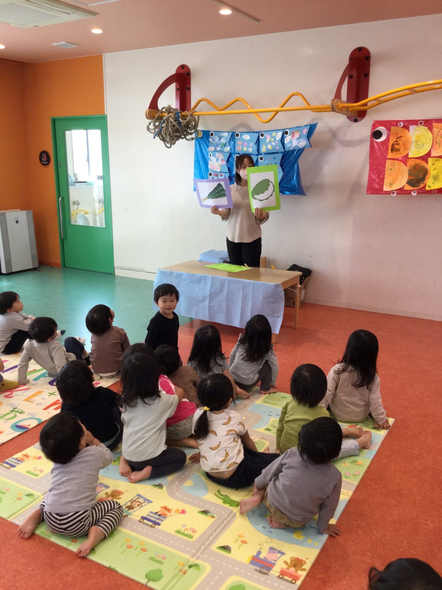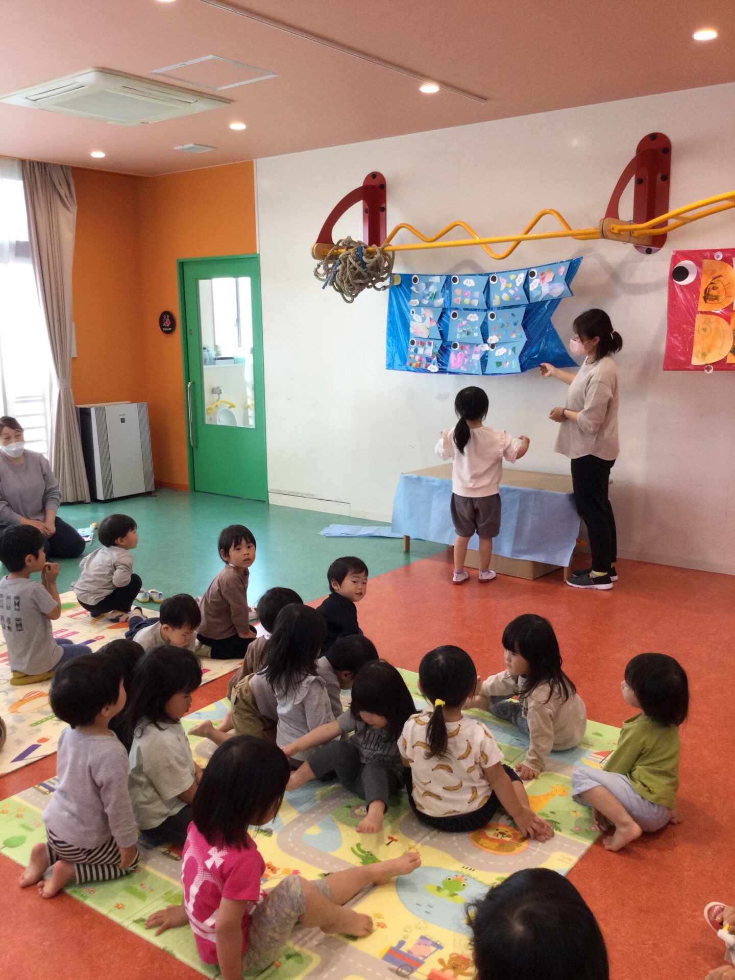あめチーム(2歳児)からくじらチーム(5歳児)集まって、お話しを聞きました。