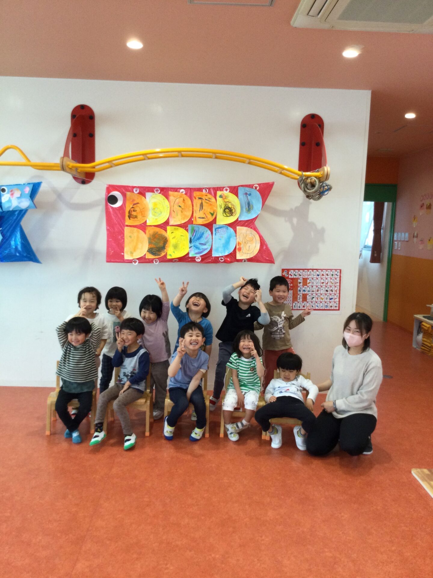 先月みんなでこいのぼりを作りました。一人2枚ずつウロコを描き(クレヨンで絵を描き、上から絵の具を塗ったはじき絵です)大きなこいのぼりに貼って完成させました。
