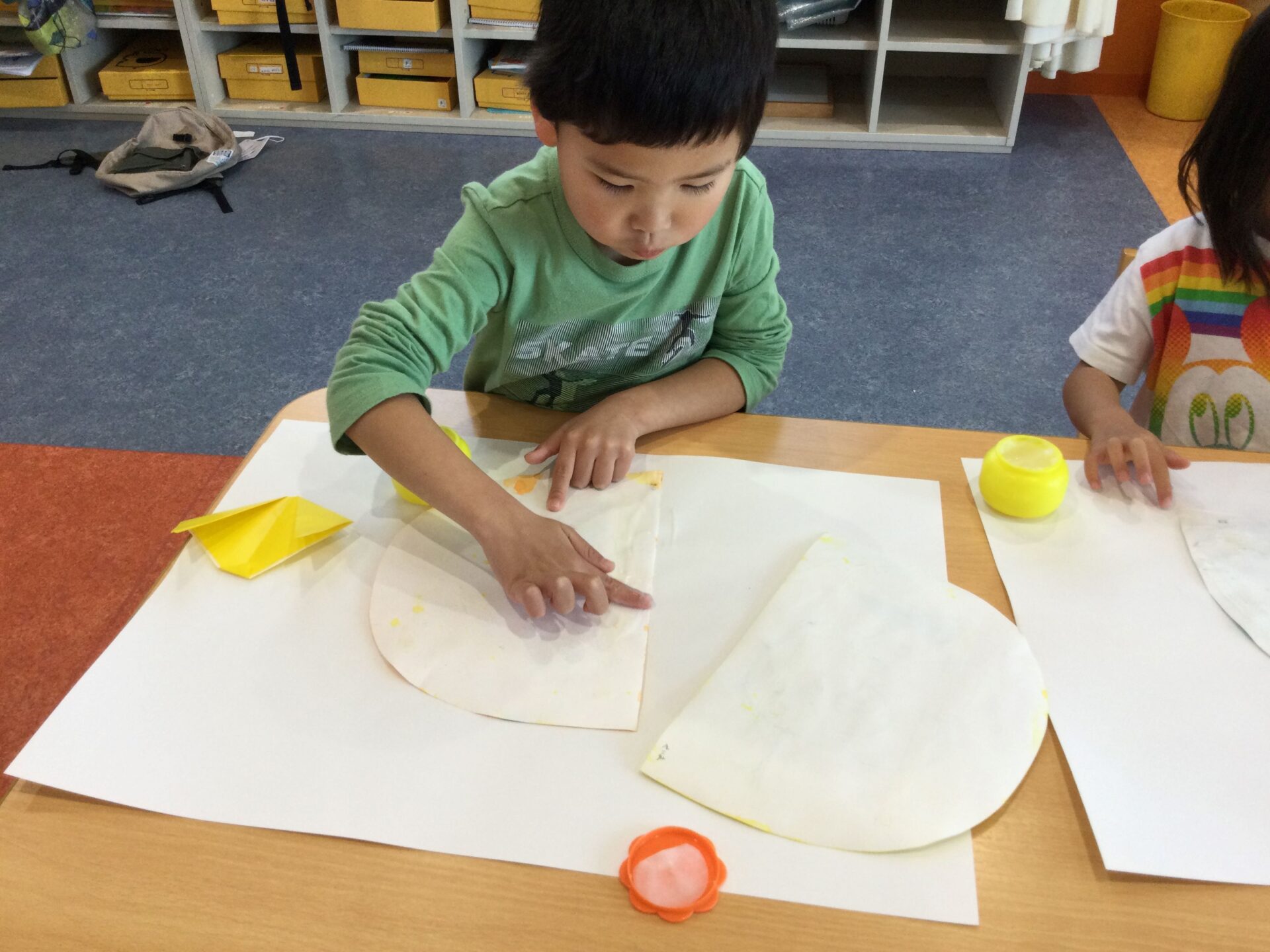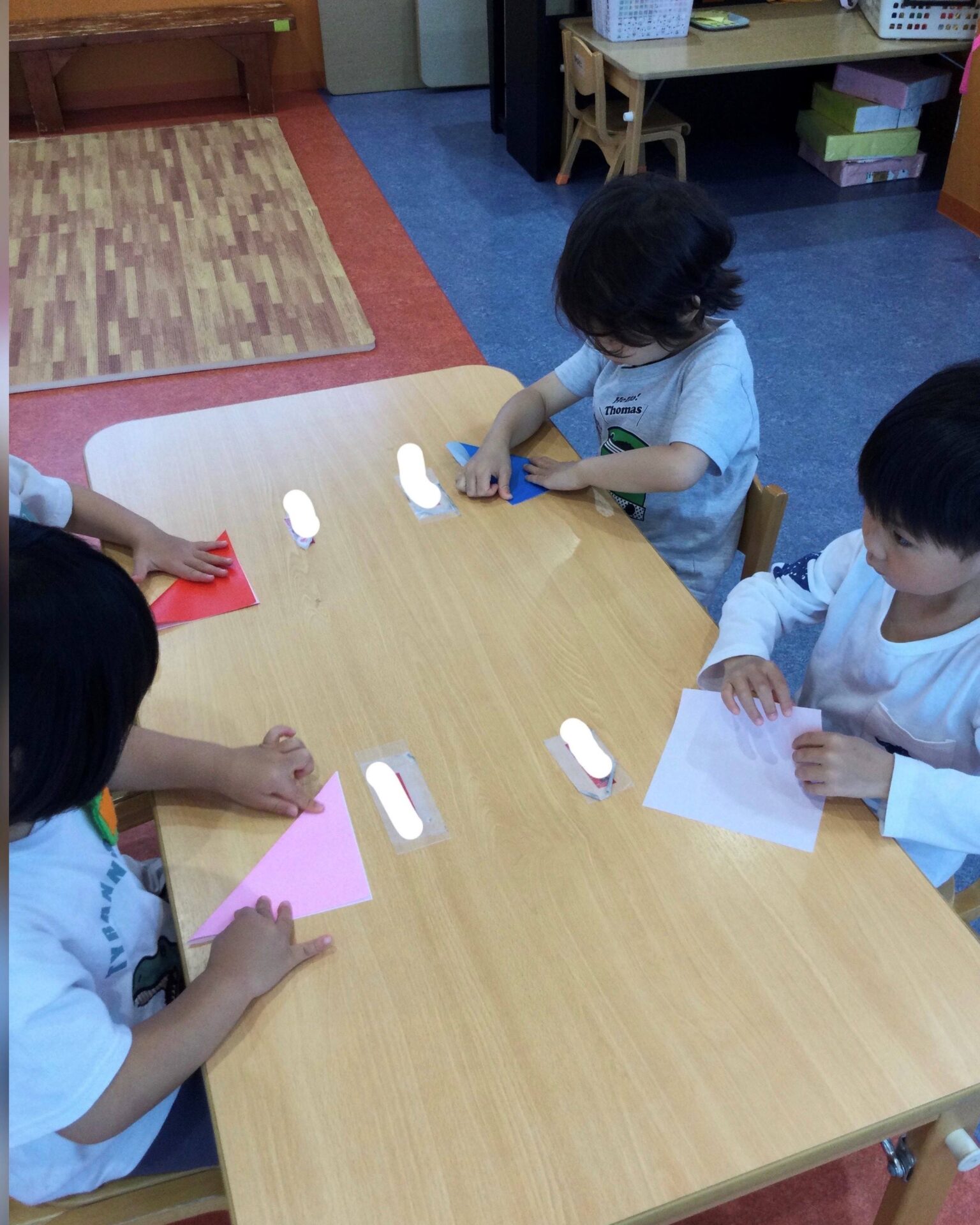 折り紙でチューリップも折りました。 角を合わせて折り線を指でしっかり押さえます。「むずかしい~。」と言いながらも諦めず「どうするの?」と聞きながら自分で折っていました🌝