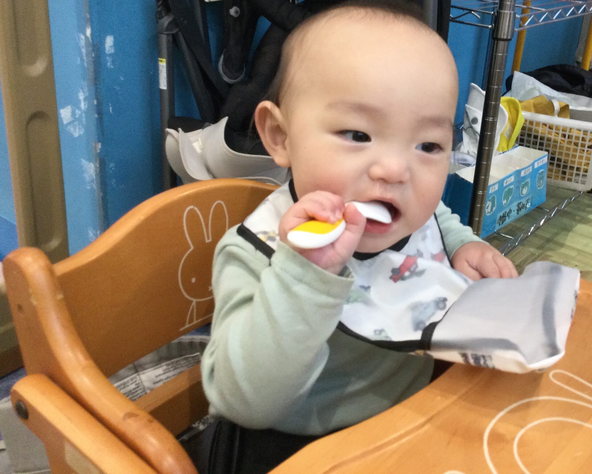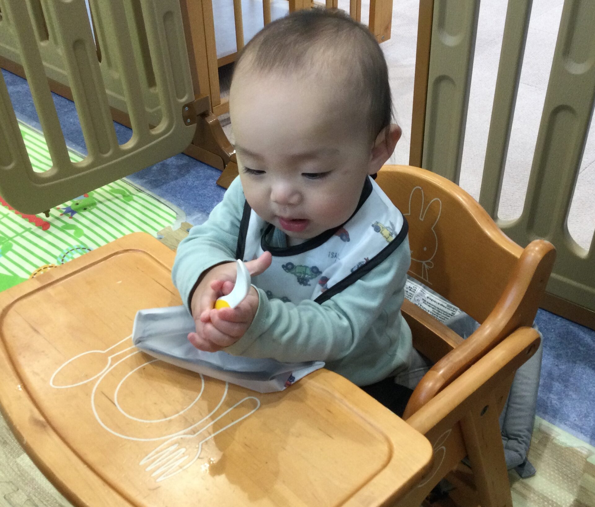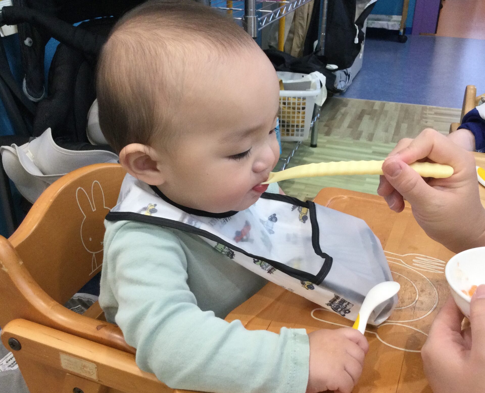 スプーンを持って自分で食べようとする姿もあります。