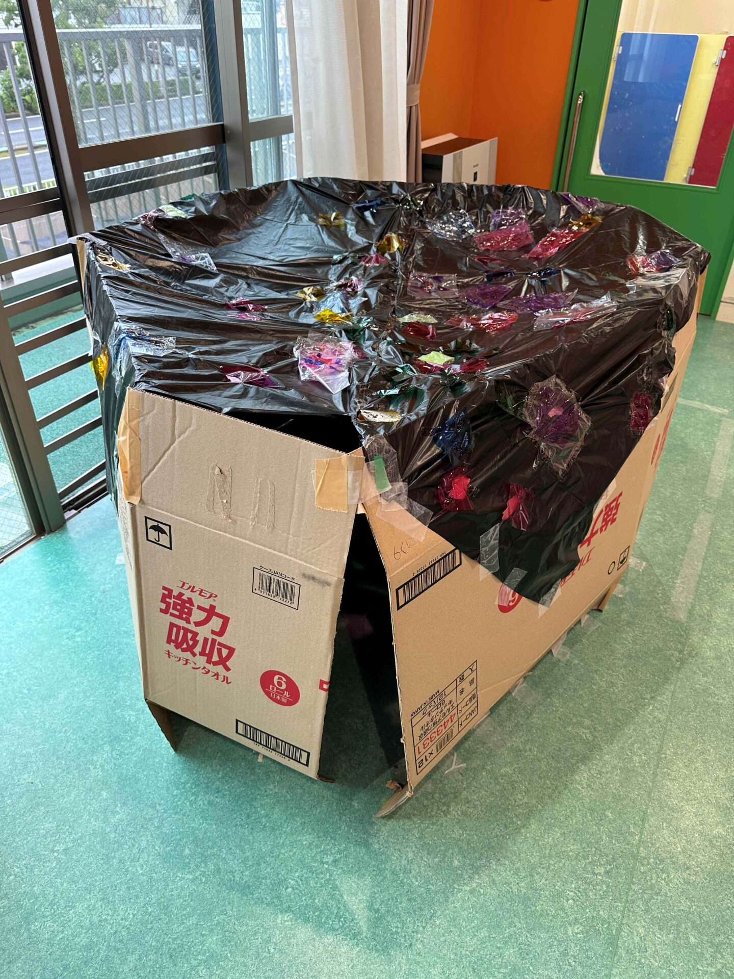段ボールを広げてつなげて、ポリ袋に穴を空けてカラーセロハンを貼っていきます。