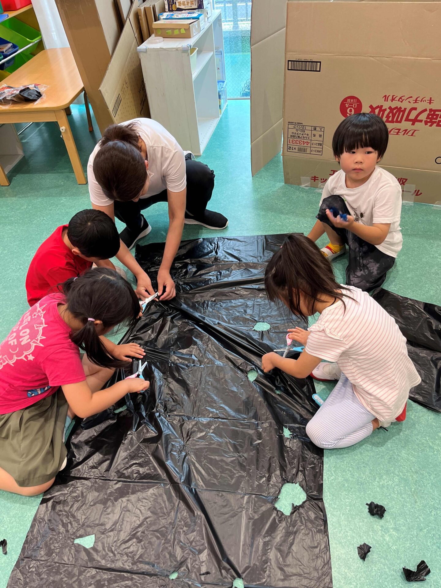 穴を開ける人、セロハンを貼る人・・・と年長児らしく分担して作業をしています。