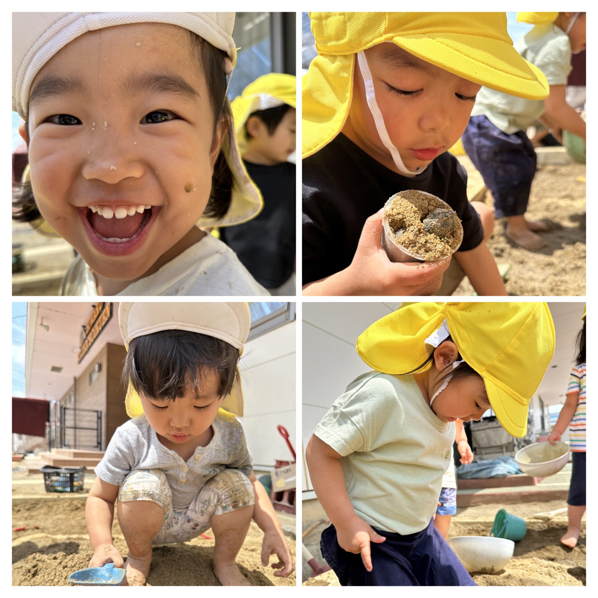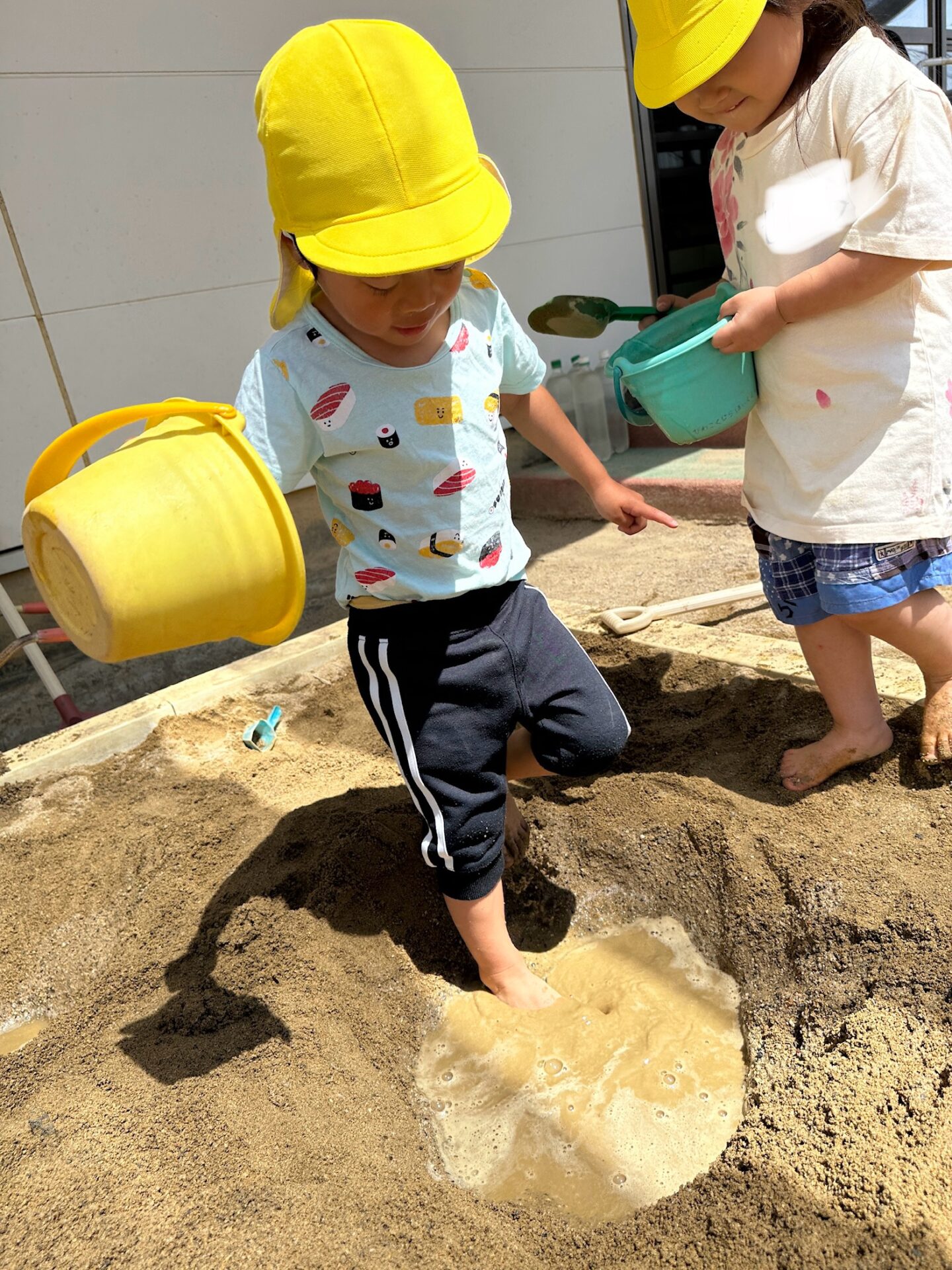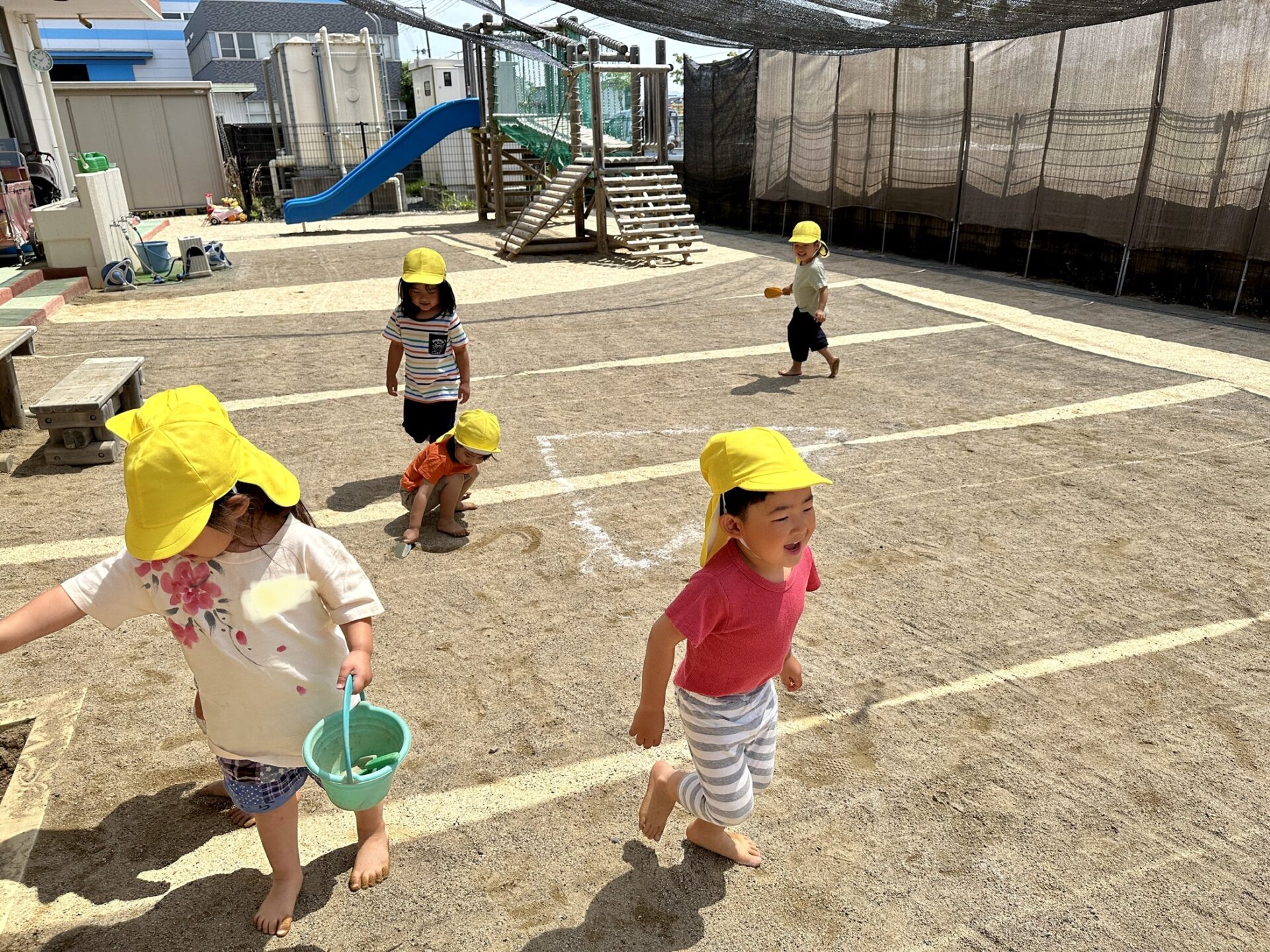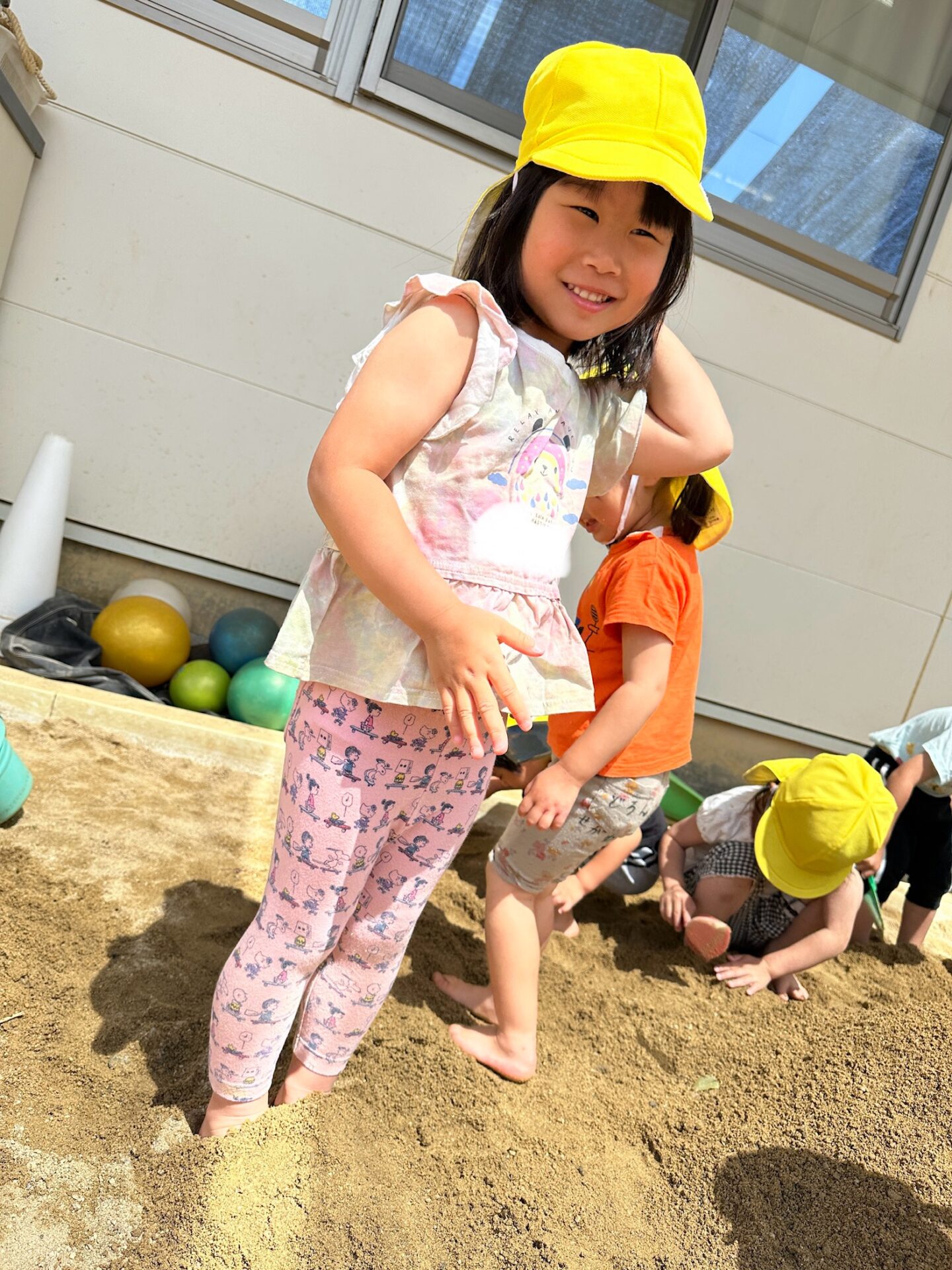 園庭に出ると、「きゃー!」と裸足で走り回ったり、「なんかつめたい!」っと教えてくれてたり、砂の感触を確かめていました。