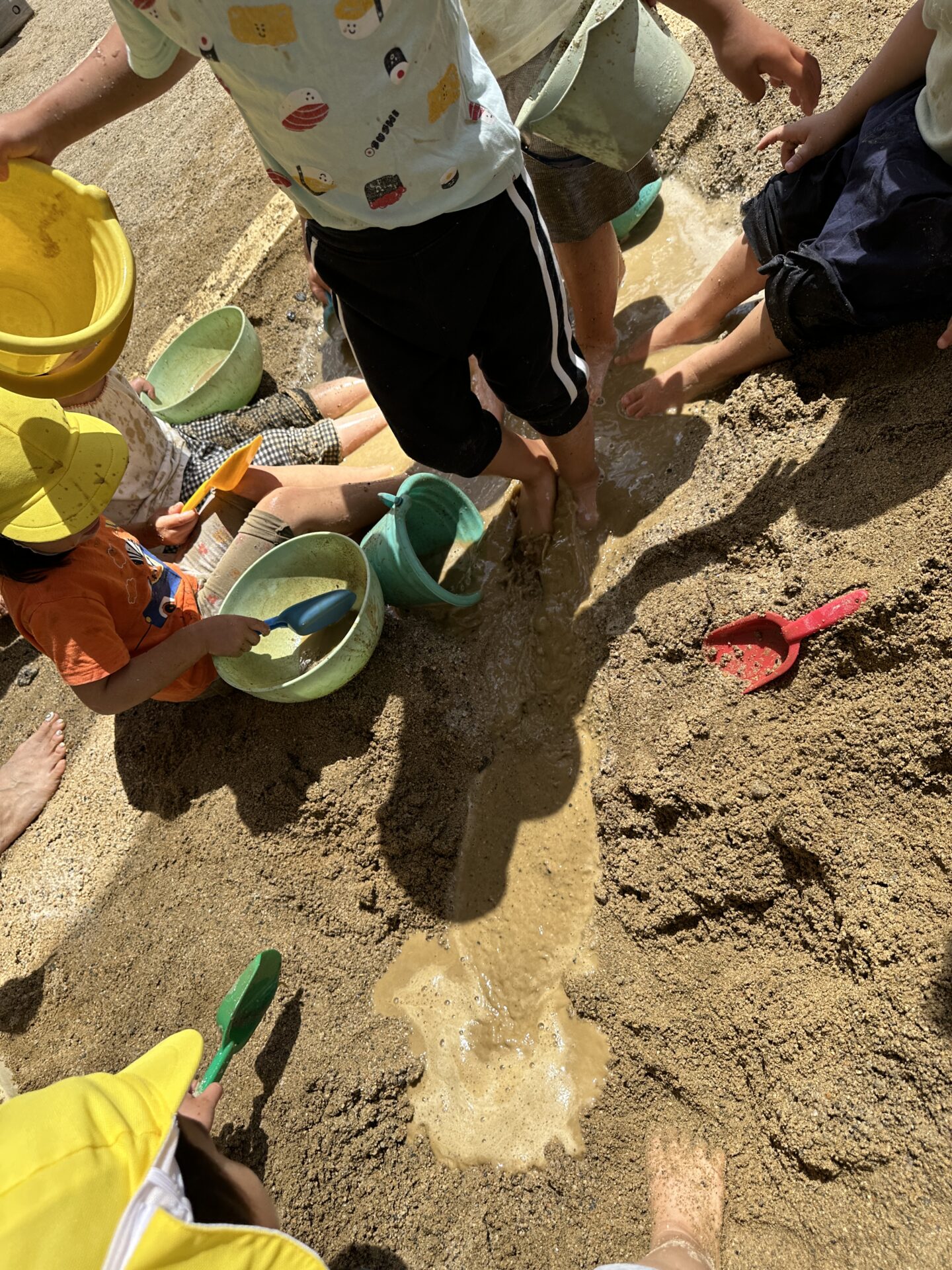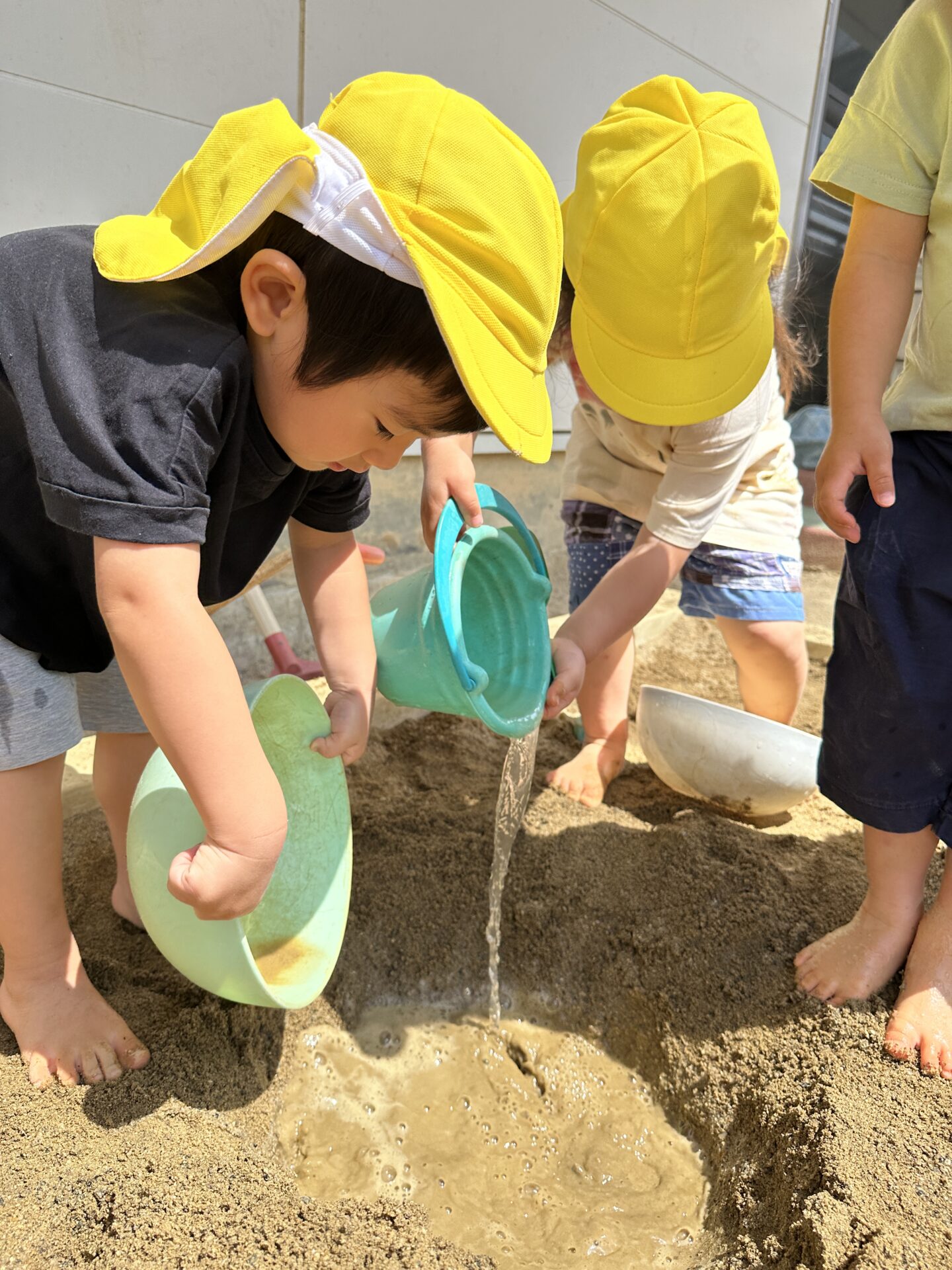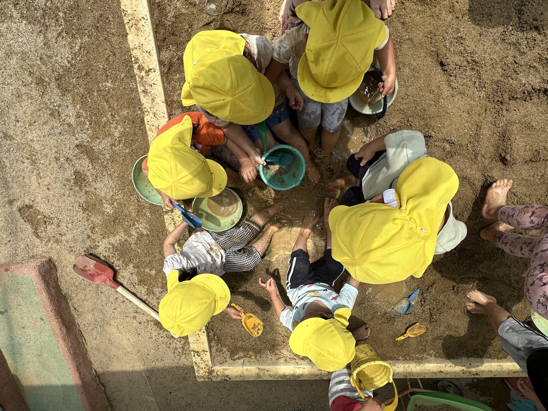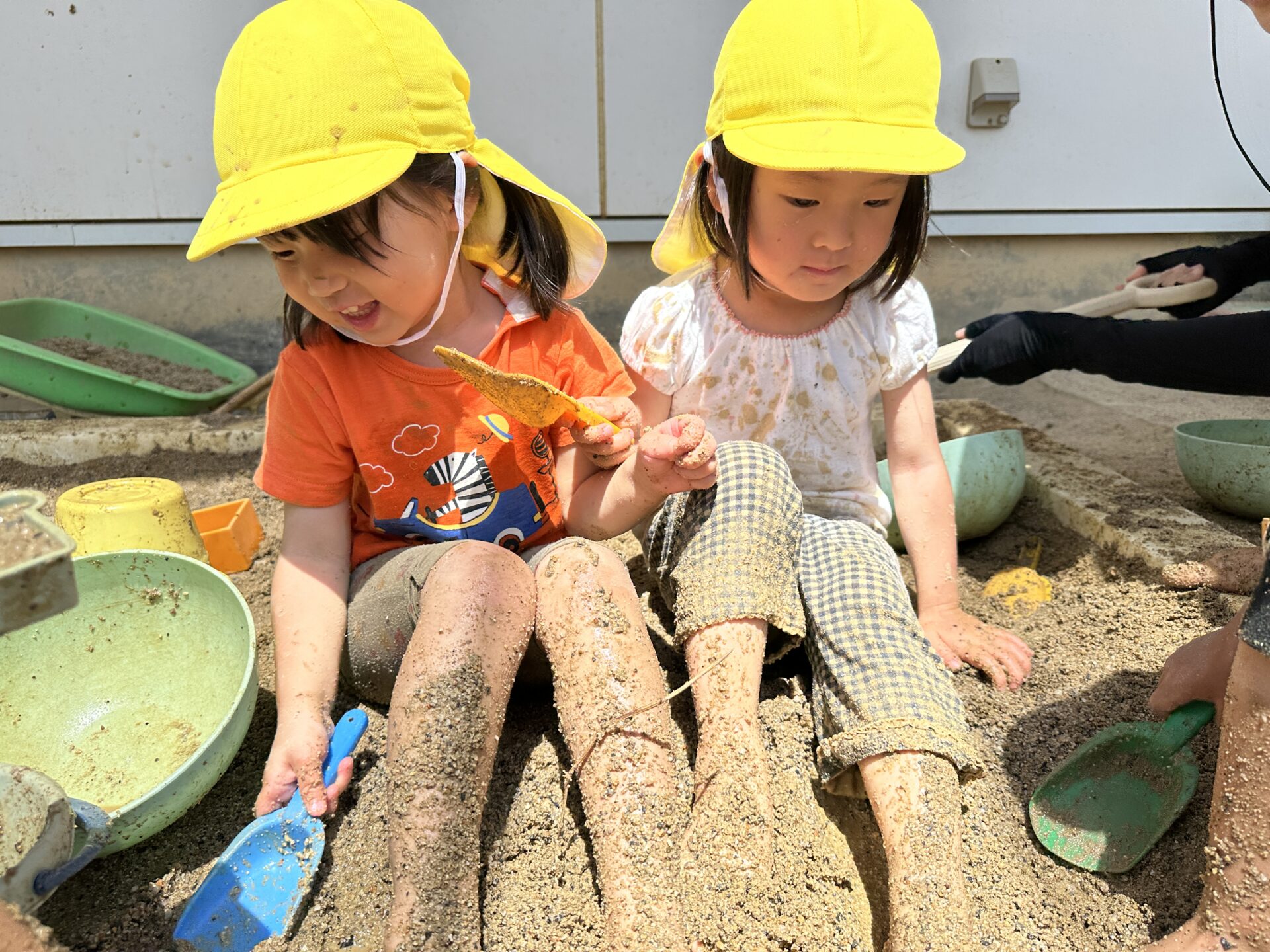 園庭に出ると、「きゃー!」と裸足で走り回ったり、「なんかつめたい!」っと教えてくれてたり、砂の感触を確かめていました。