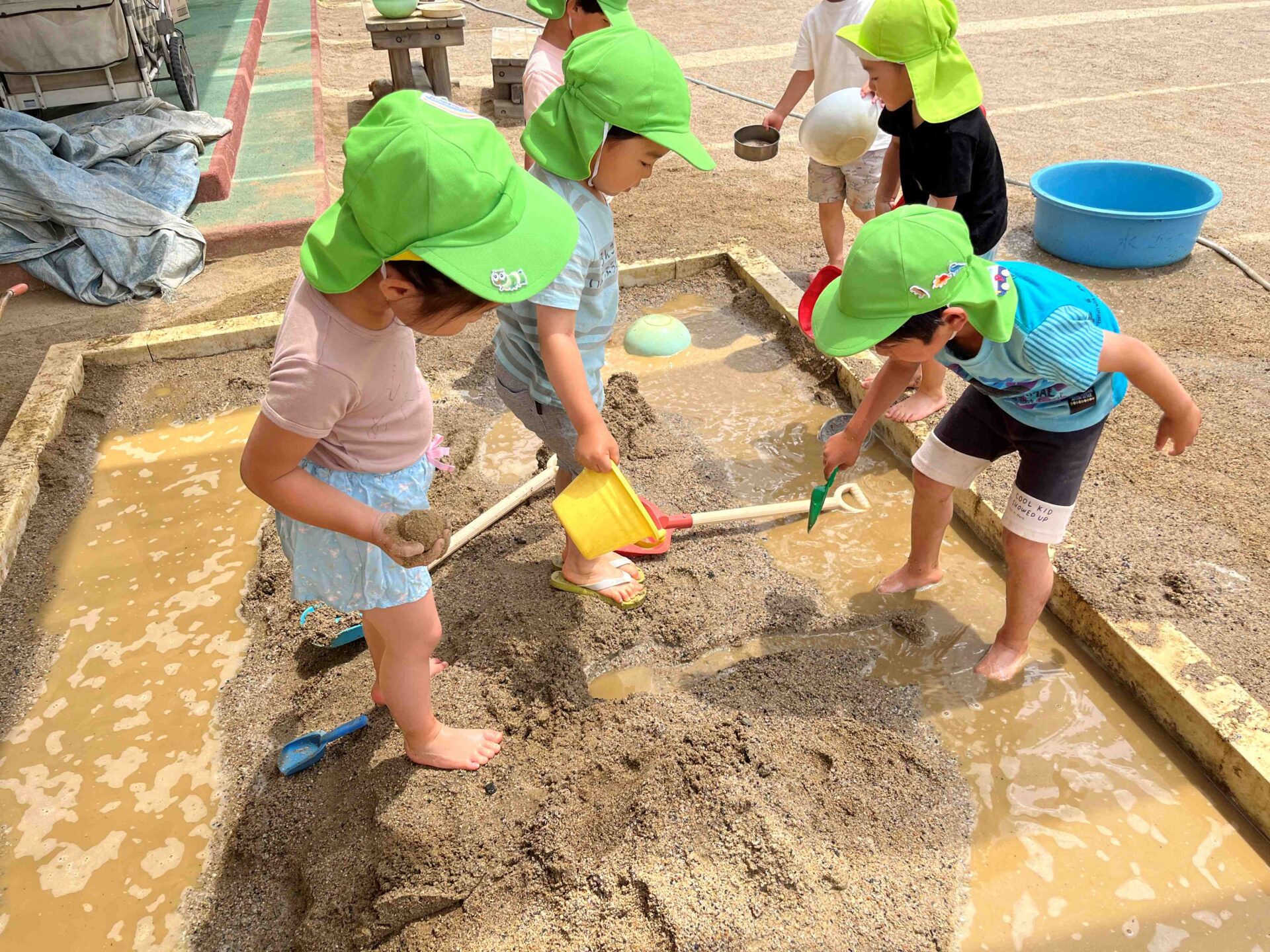 泥んこ遊びを楽しむ中で、「〇〇ちゃん、ここつなげよう!」「水、運んできてー」など、友だちやりとりをする声がたくさん聞こえてきます。