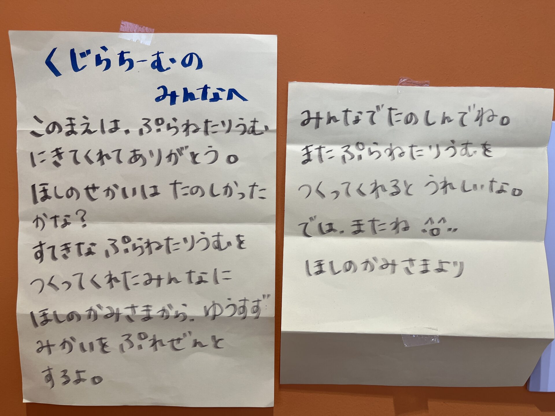 みんなで作ったプラネタリウムの中に星の神様から、夕涼み会の