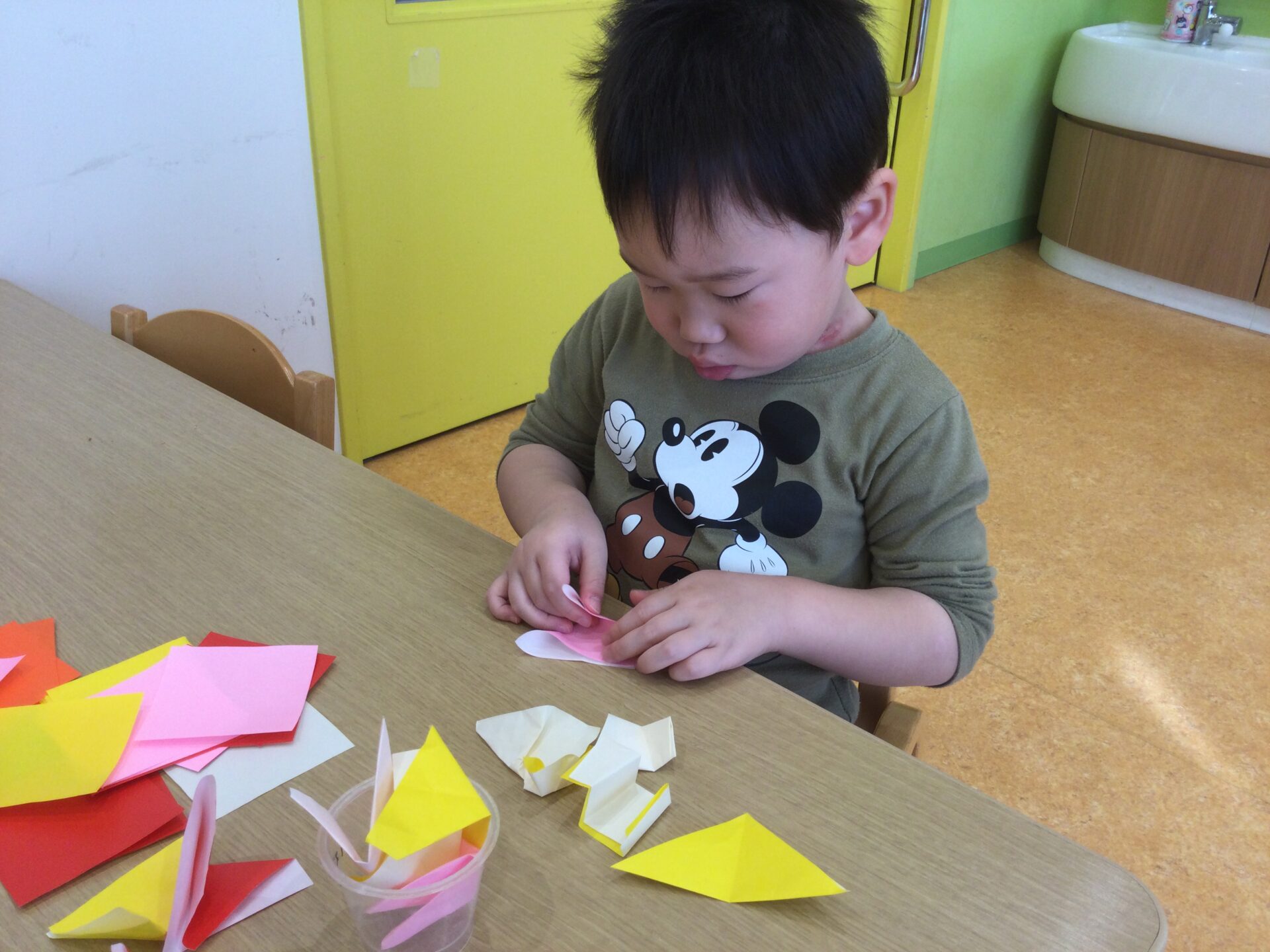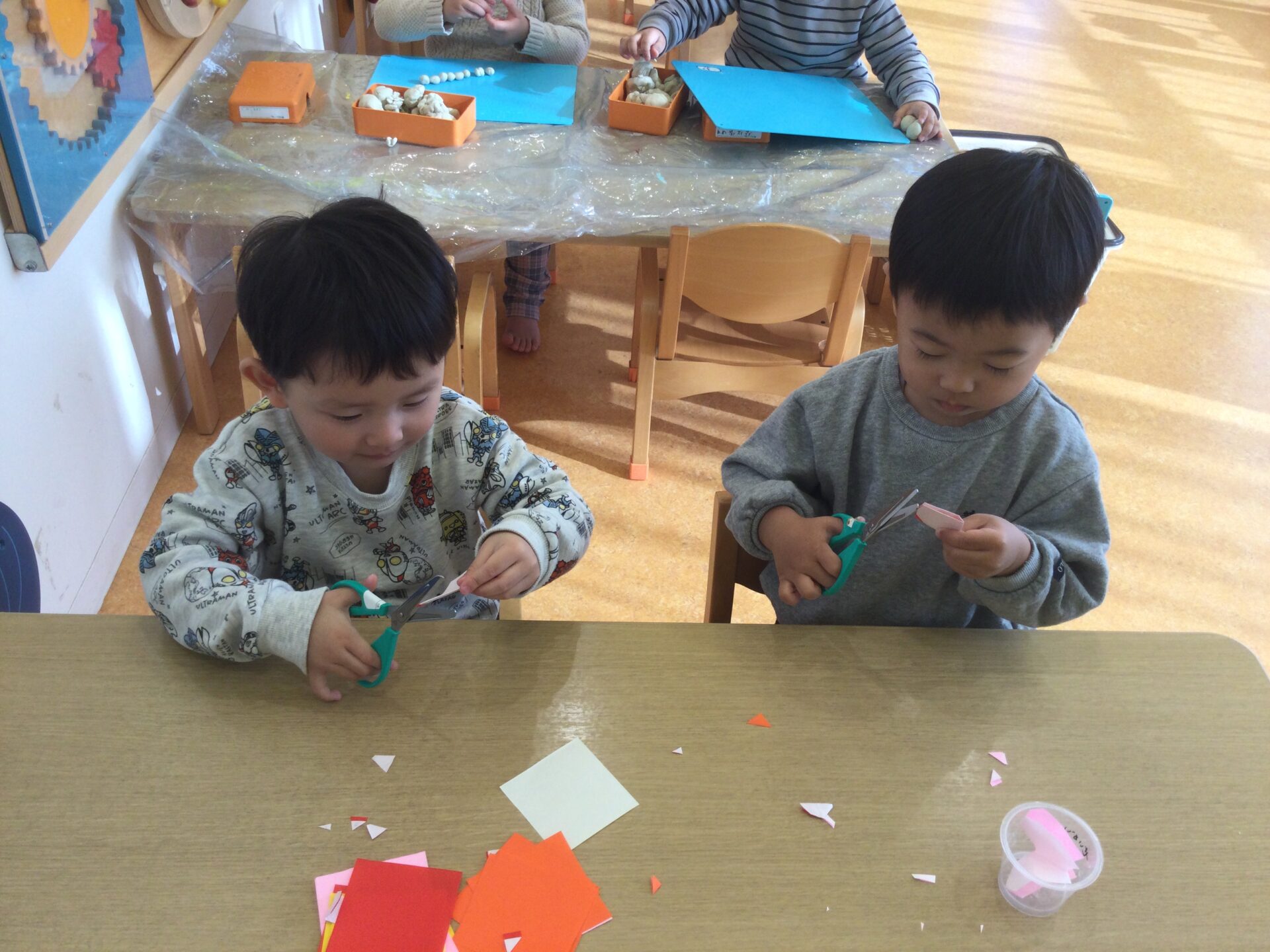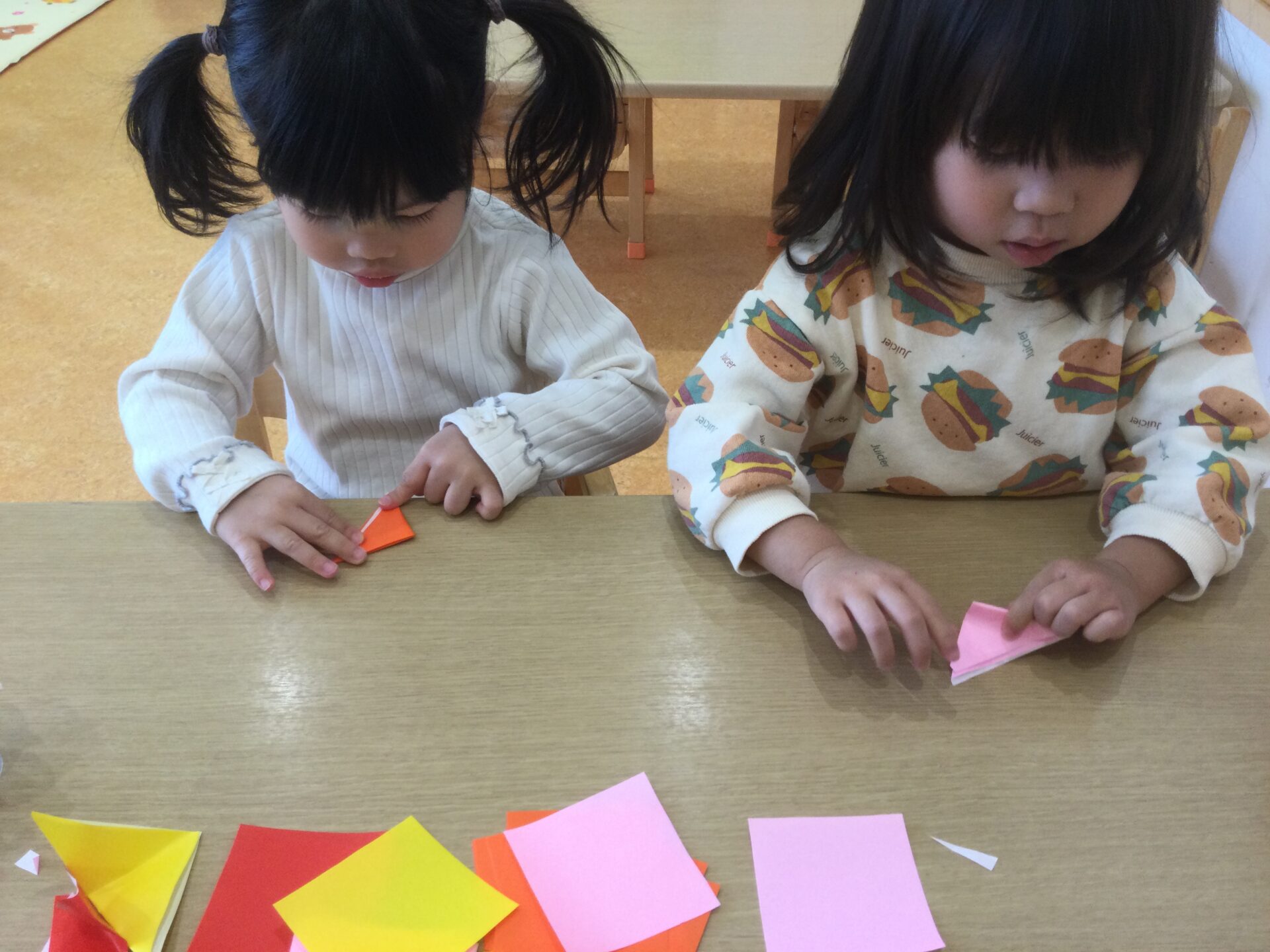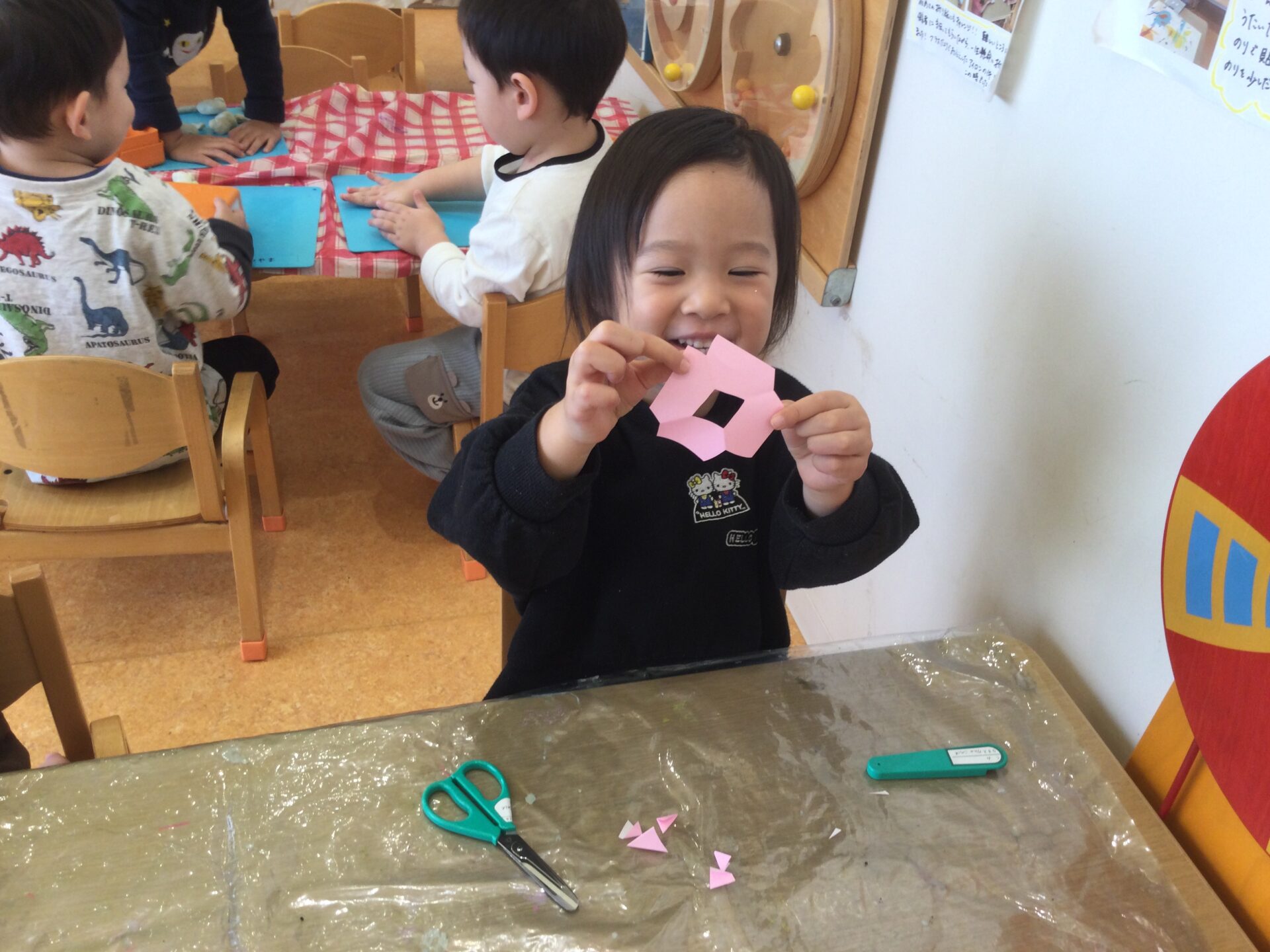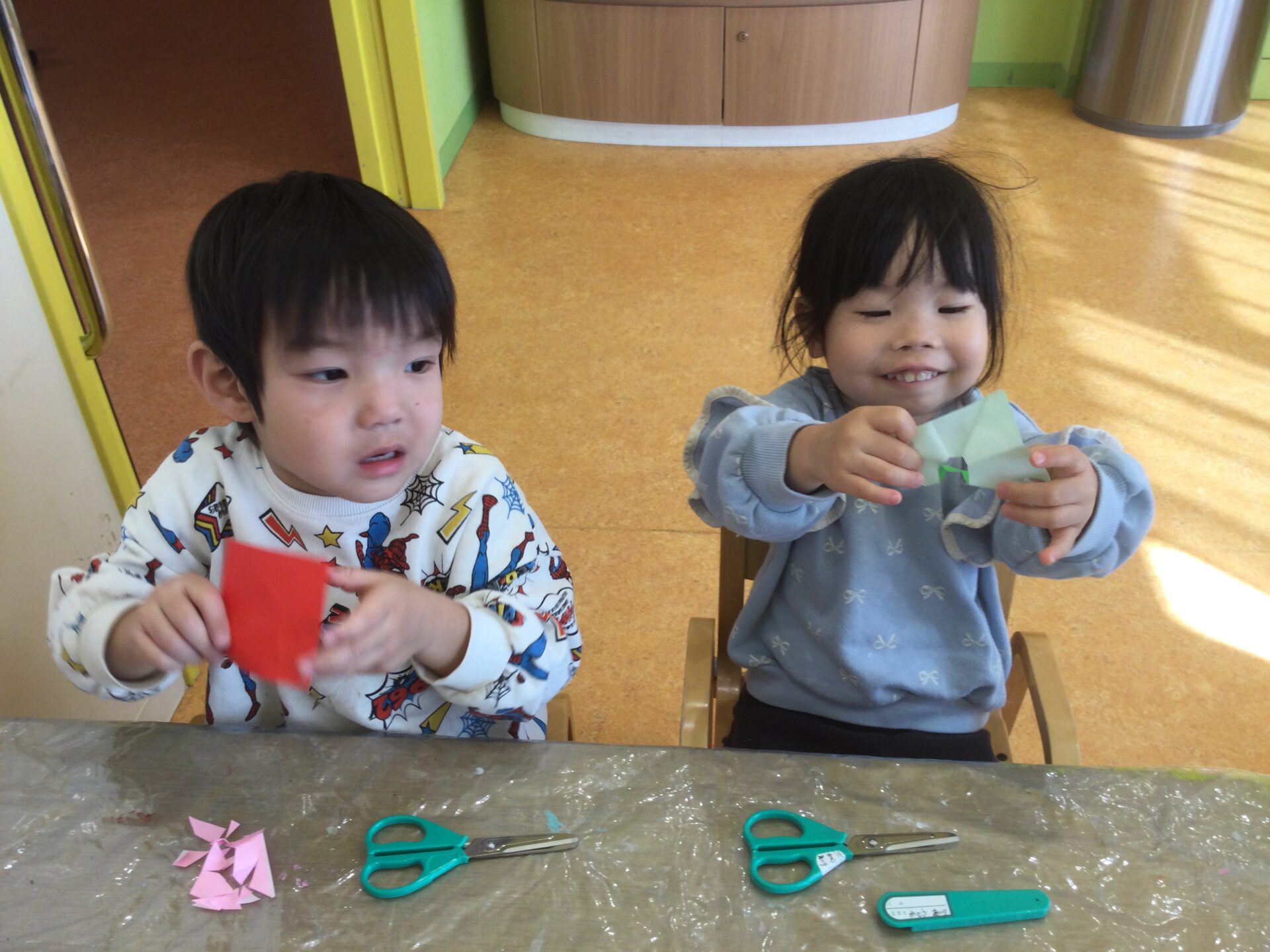 以前はハサミの開閉が難しく、手指先に力が上手く入らない子が多かったですが、今では自分で折り紙を持ちながら切ることができるようになり、成長を感じ嬉しく思います😊