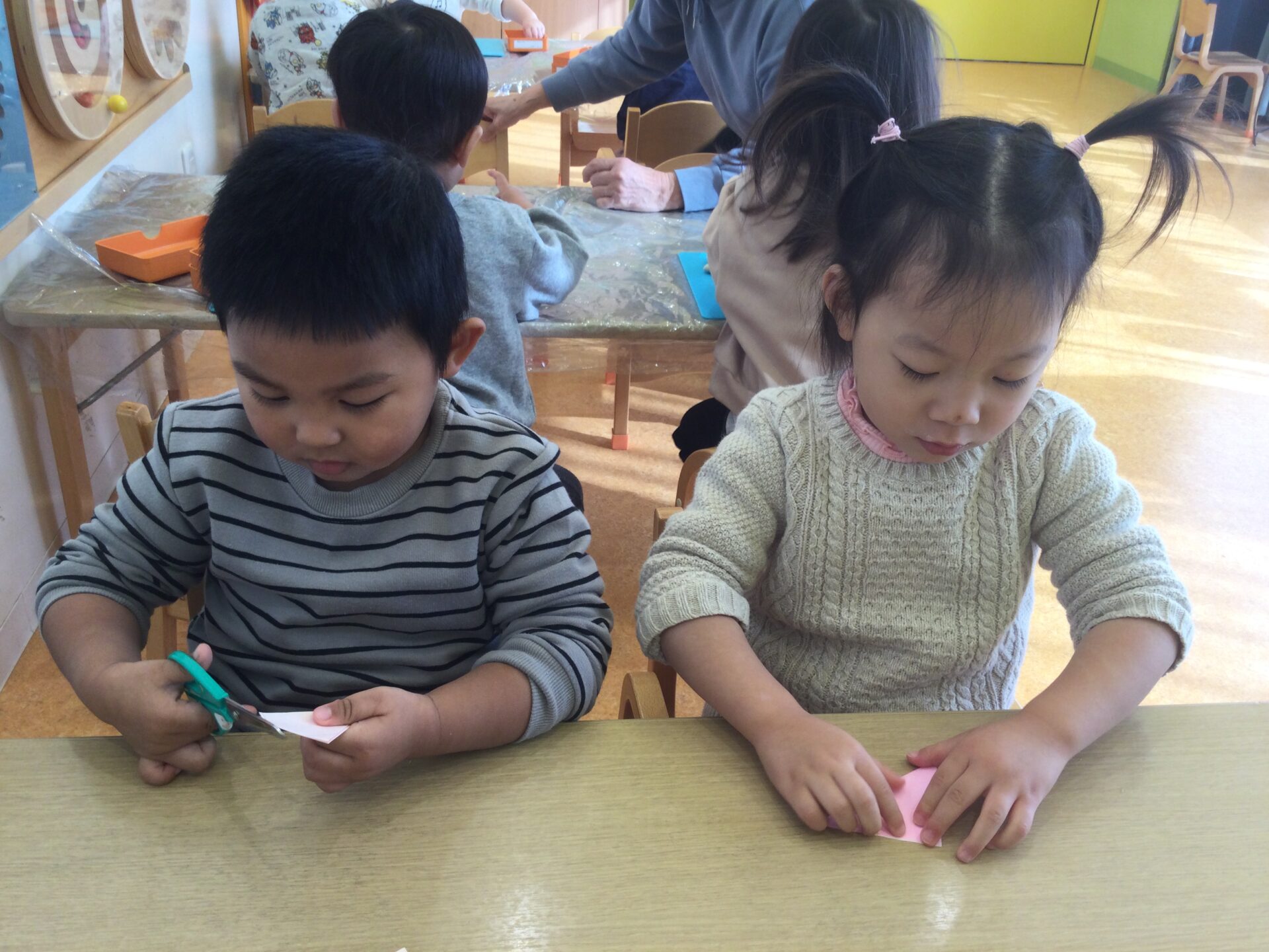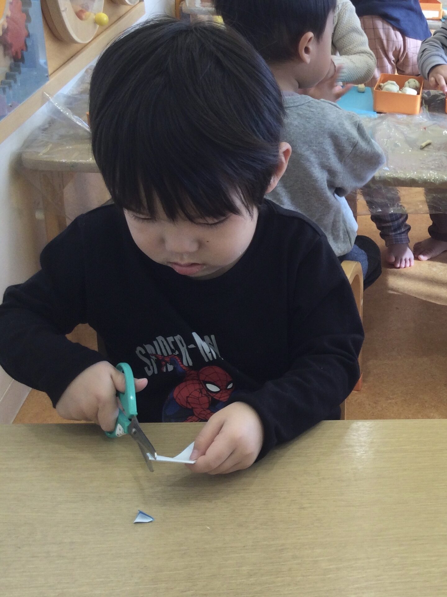 片手に折り紙、片手にハサミを持って、自分で切れるようになってきました😄