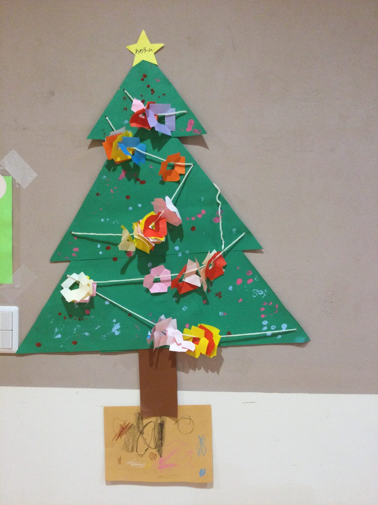「あめチームでクリスマスツリーをつくろう。」と提案すると「つくりたい!」と意欲満々の子どもたち。みんなで大きなツリーを作ることにしました。