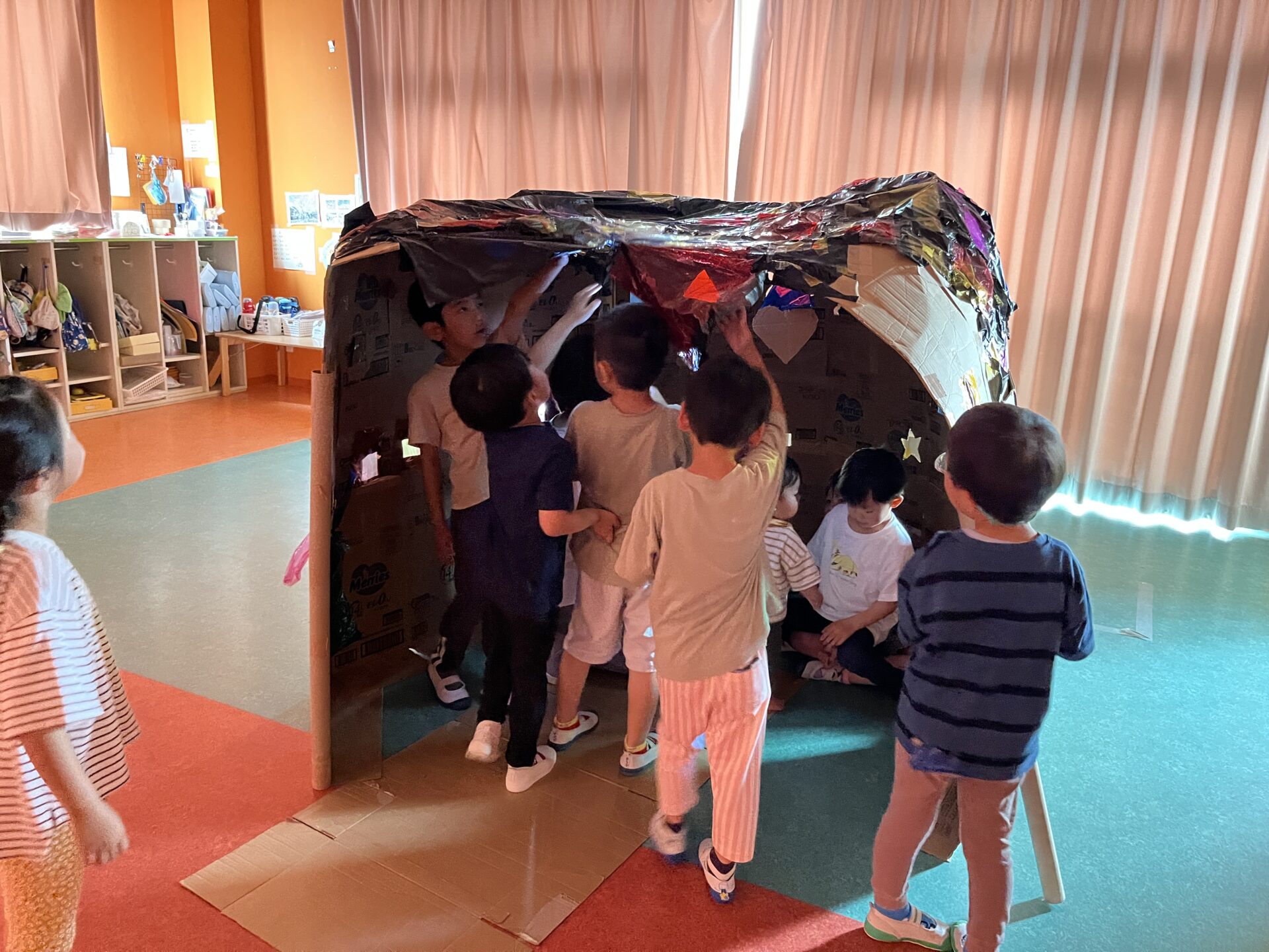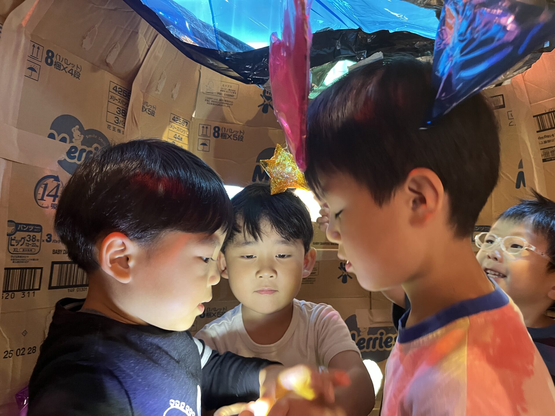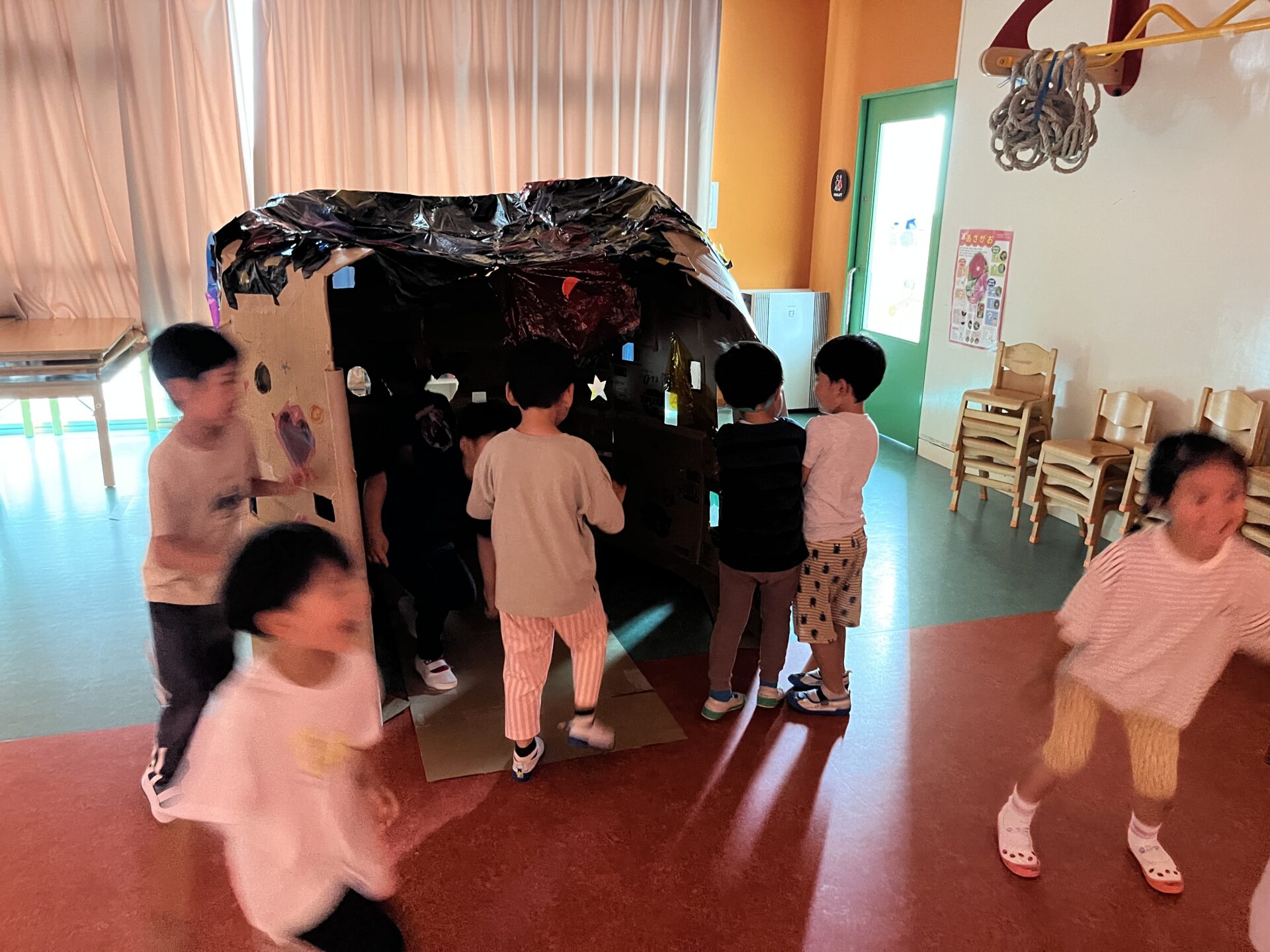 プラネタリウム鑑賞に行った後、子ども達の意夜空に対する思いや余韻が膨らんで、自分達のプラネタリウムを作る事にしました。