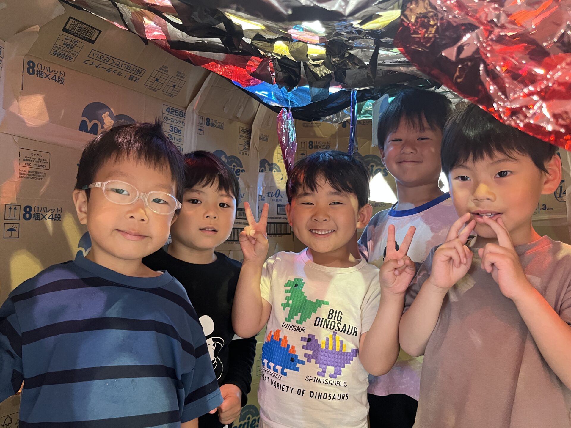 土曜参観の日に、お父さん、お母さんに周りの段ボールにも素敵な星を作ってもらって大喜びの完成です。